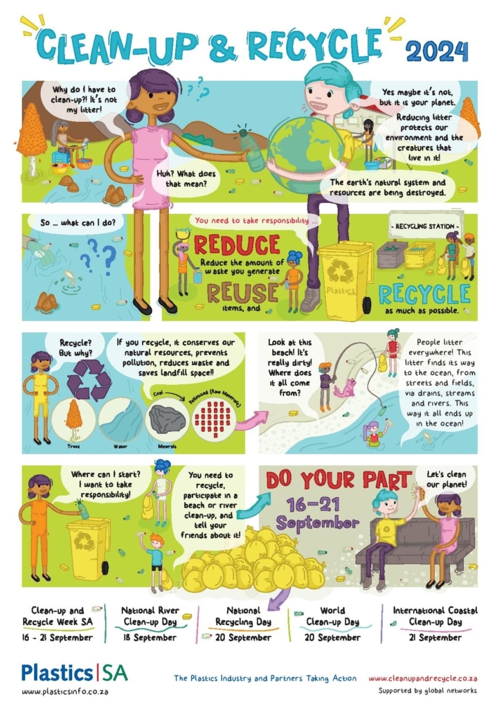 Plastics SA also announced the launch of a nationwide competition. Open to individuals, groups, and organisations, the competition encourages participants to submit before and after pictures of their clean-ups, along with details on the number of participants and bags of litter collected. Additionally, there is a special category to honour and reward those who establish effective recycling systems at home, school, or at their workplace. The competition features generous prizes totalling R9,000, with R5,000 for first place, R3,000 for second place, and R1,000 for third place.